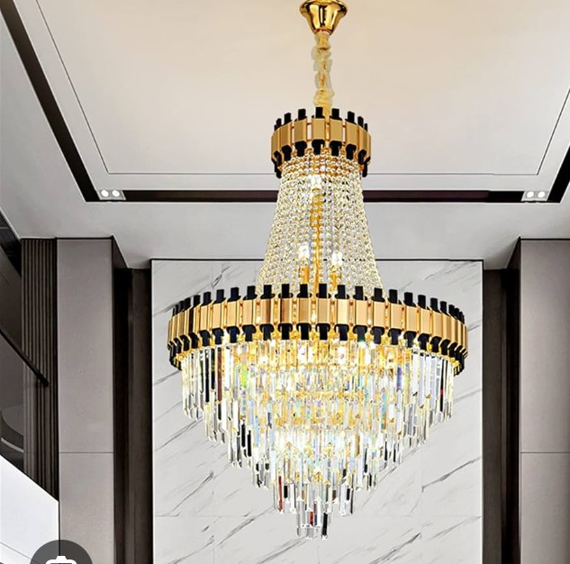 Crafted with a stunning gold and black finish, this multi-tiered masterpiece features cascading, faceted crystals that capture and refract light, creating a breathtaking display of shimmer and sparkle. Its sophisticated design effortlessly blends classic elegance with modern flair, making it the perfect focal point for any grand entrance, dining room, or luxurious living area. Elevate your home décor and bask in the opulent glow of this magnificent statement piece – a true testament to refined taste and dazzling illumination."